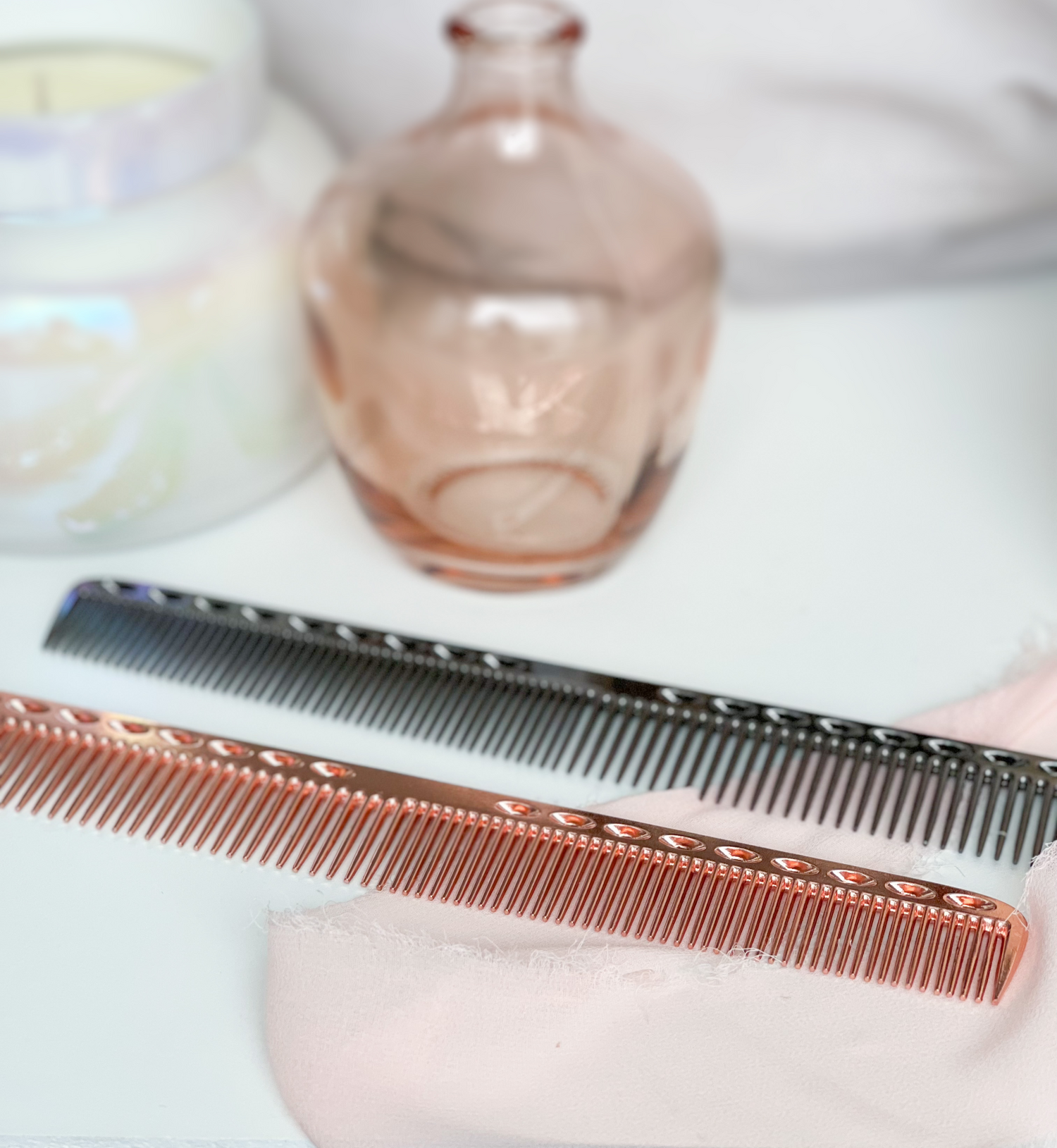 Rose Gold and Gun Powder Gray Aluminum Cutting Combs.