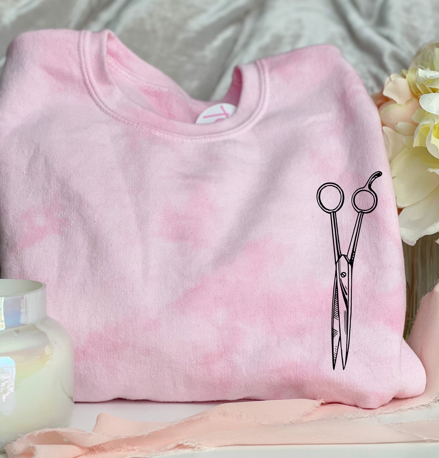 Unisex size tie dye crewneck sweatshirt with scissors screen printed on left side.